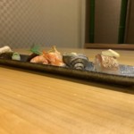 魳(かます)小袖寿し 巻海老酒煮 いか春風焼き 姫栄螺(さざえ)ブルゴーニュバター風味 鴨ロースオレンヂ蒸し 出汁巻玉子 焼き茄子白和え