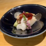 縮み蛸と湯〆帆立 蓮芋(はすいも) 白瓜 紫蘇ジュレー